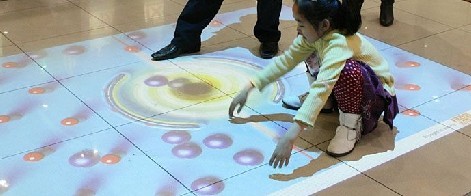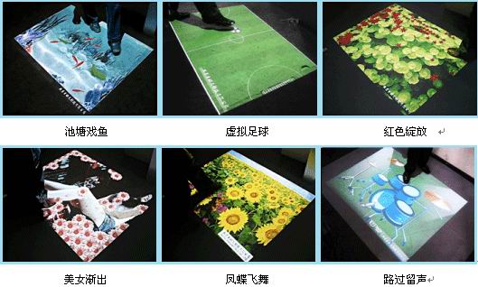 本系统 采用悬挂在顶部的投影设备把影像效果投射到地面,当参访者走至投影区域时,通过系统识别,参访者可以直接使用双脚或动作与投影幕上的虚拟场景进行交互,各种互动效果就会随着你的脚步产生相应的变幻。地面互动投影系统是集虚拟仿真技术、图像识别技术于一身的互动投影项目,该项目包括水波纹、翻转、碰撞、擦除、避让、跟随等表现形式。观众通过身体动作来与地面的图像进行互动,