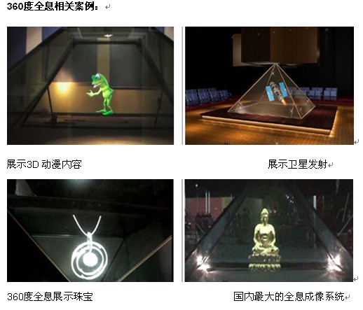 深圳时代中视科技发展有限公司  360全息幻影成像系统360全息也称360度全息和360度全息成像,我们在这里称它为360度全息成像。360全息成像也被称之为三维全息影像、全息三维成像,它是由透明材料制成的四面锥体,观众的视线能从任何一面穿透它,通过表面镜射和反射,观众能从锥形空间里看到自由飘浮的影像和图形。四个视频发射器将光信号发射到这个锥体中的特殊棱镜上,汇集到一起后形成具有真实维度空间的立体影像。
