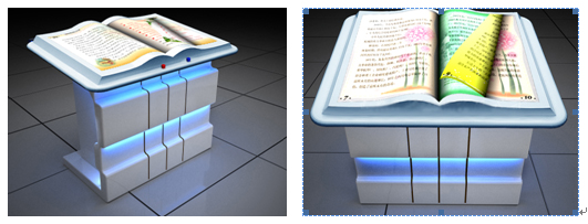 •观众站在书模型前做翻书动作时,翻书感应器检测出挥手的方向,计算机立即控制图书翻页,既可以向前翻,也可以后翻;